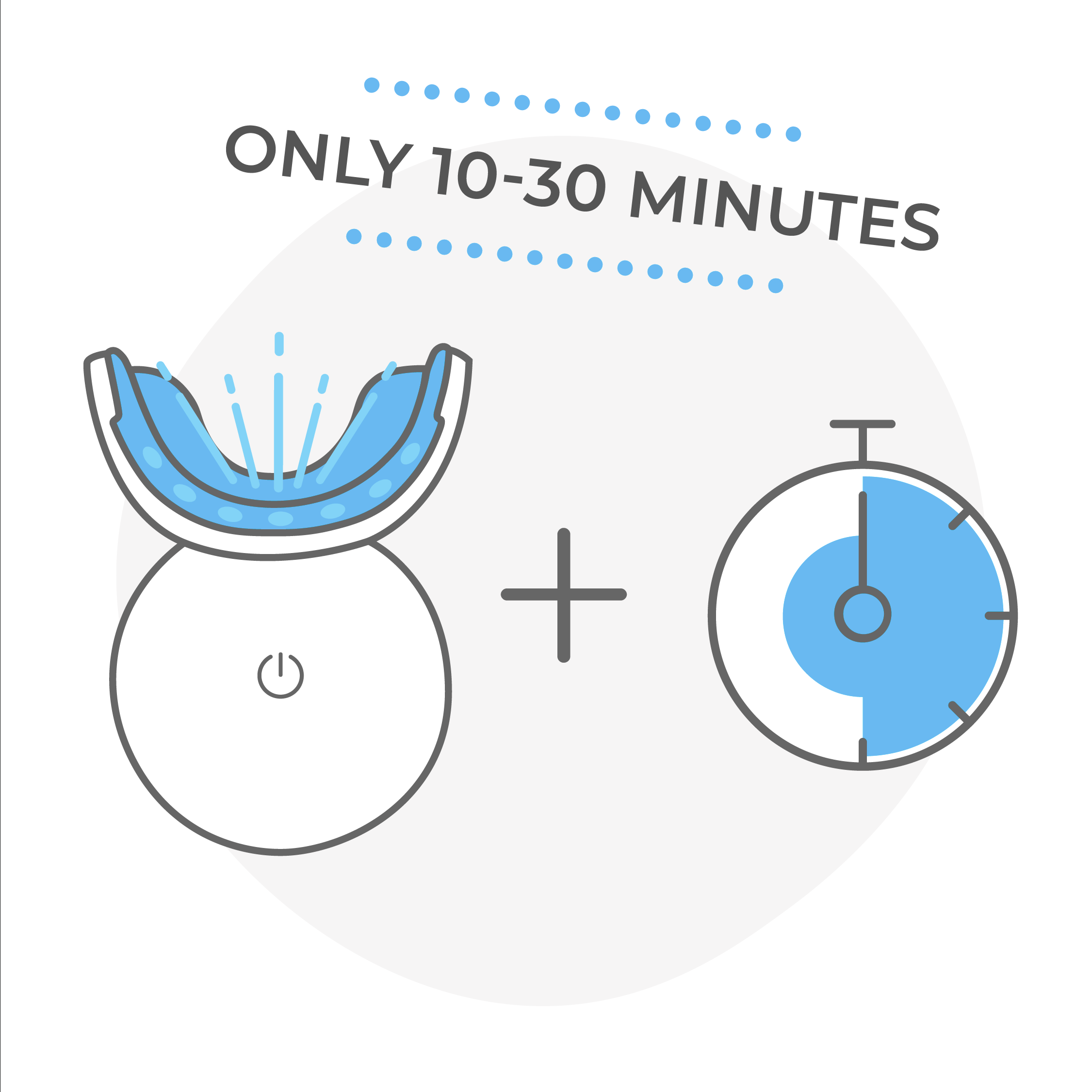 Insert the tray into your mouth, push against your teeth and turn the accelerator light on. The light needs to be kept on for 10-30 minutes, so take this time to relax while it works its magic.